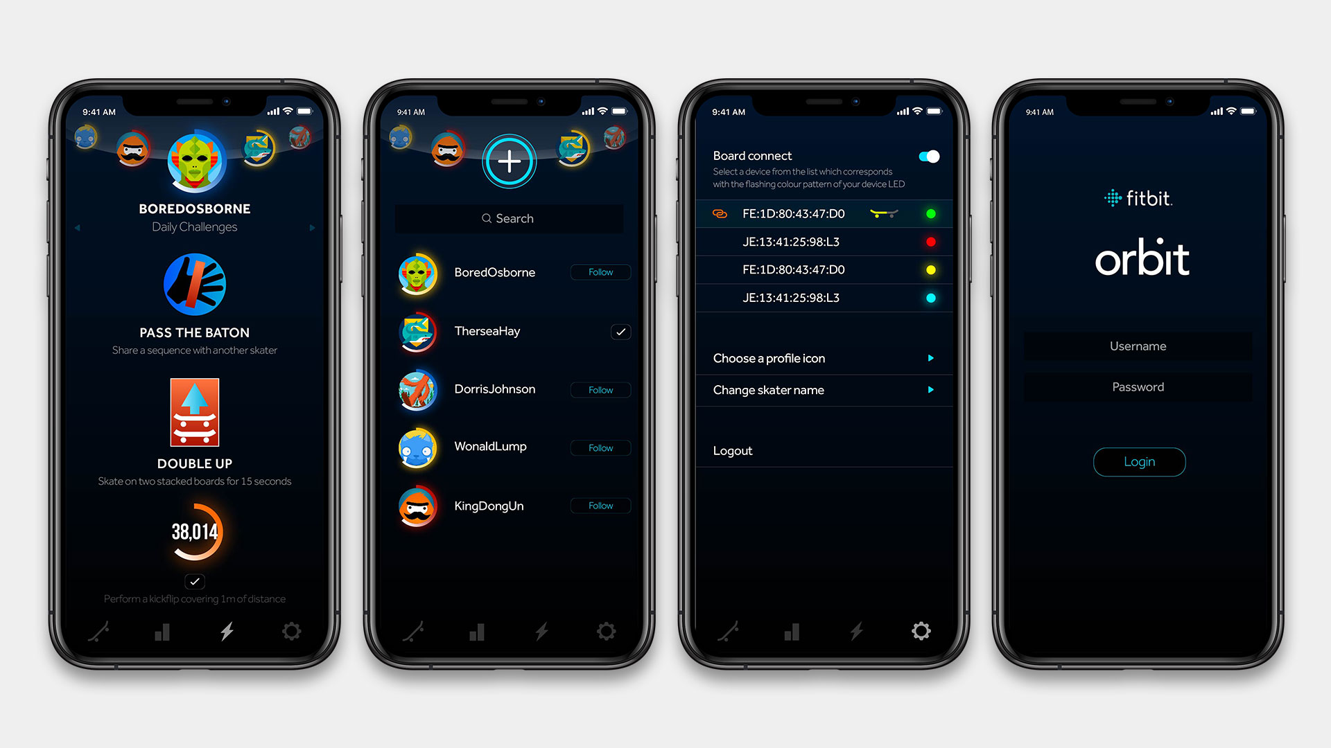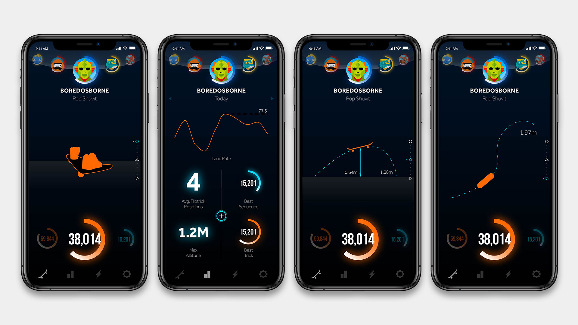 Features include: Real world movement data such as height, shape and distance of tricks performed; daily customised statistics such as land rate, maximum trick altitude, best trick sequence etc; daily challenges; follow other skaters to compare statistics and complete challenges together. I developed the entire UI and UX, including all the iconography.
